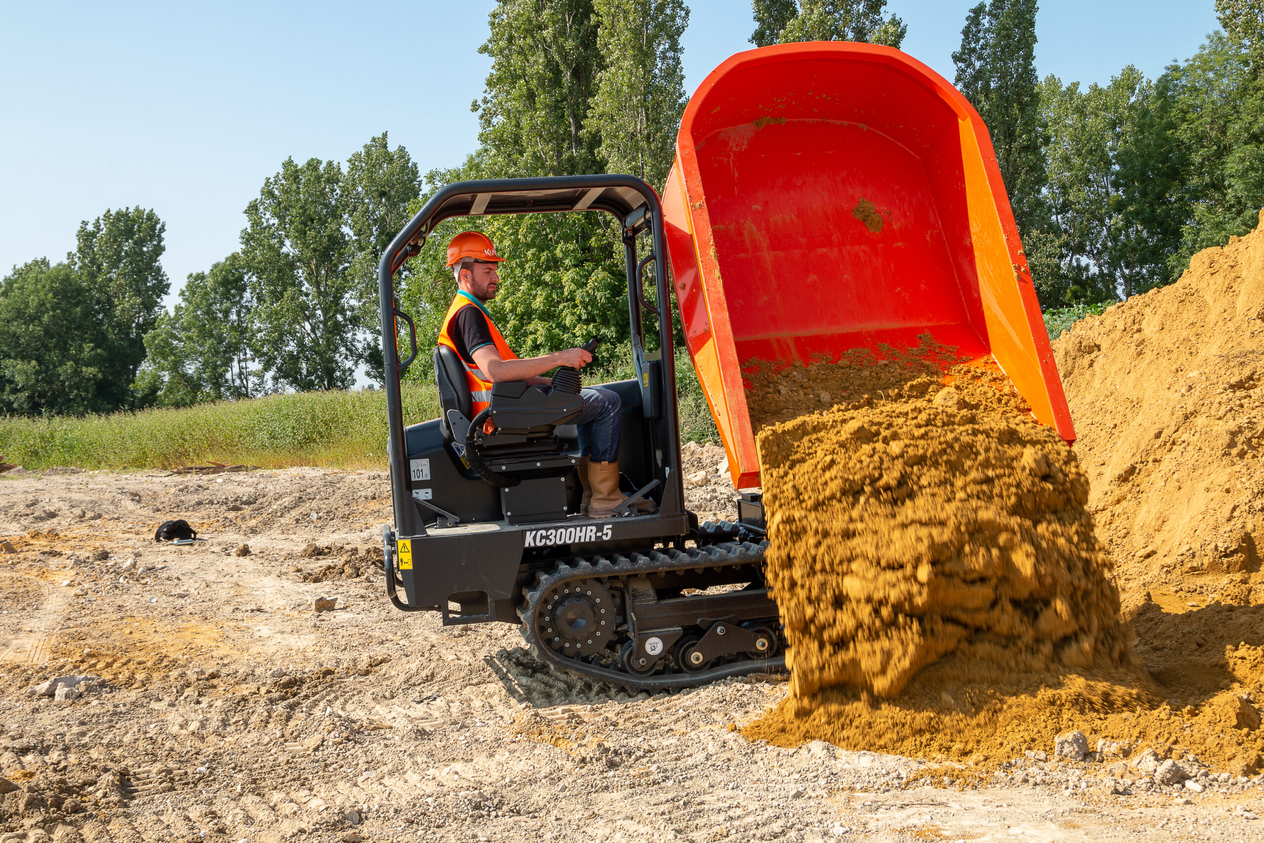 O Kubota KC300-5 é o parceiro ideal para movimentação de terras em condições difíceis. Com uma capacidade de carga impressionante e um motor diesel Kubota Stage V, este dumper de rastos combina força bruta com uma manobrabilidade surpreendente, permitindo trabalhar em declives acentuados ou solos moles onde os veículos de rodas falham.